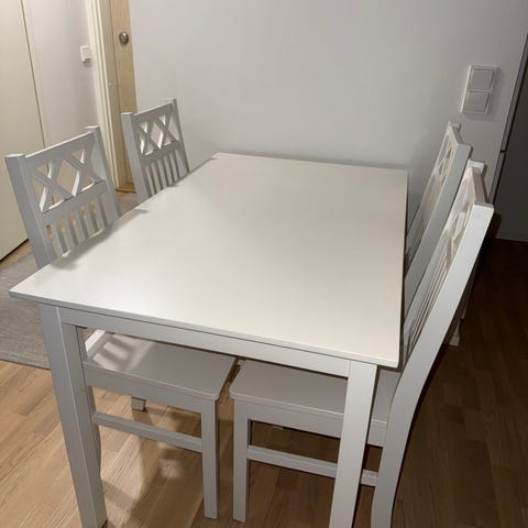 Pöydän pinnassa muutama rinkulajälki jotka ei lähde pois, näkyy tietyssä valossa mutta ei mitenkään loista. Yhdessä pöytälevyn kulmassa pieni pala pinnoitetta repeytynyt irti, ks. kuva. Myös tuolien pinnoitteessa saattaa olla jotain pientä jälkeä, mutta varsin huomaamatonta.