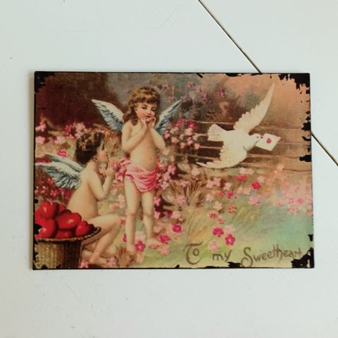 Taulu missä enkeli ja kaksi lasta. Halkaisija noin 18 cm.