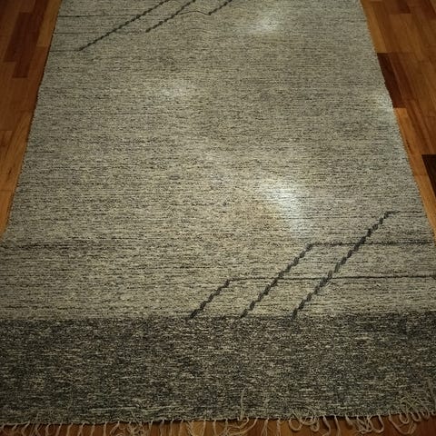 Iso valkoinen matto, jäänyt parin viikon jälkeen käyttämättömäksi. Säilytetty kuitenkin sisätiloissa suojattuna. Kts.kuvat, yhdessä kohdassa karannut lanka, helppo korjata. Tarkempi syynäys jää ostajalle. Kulmat ehkä myös vähän koholla.
