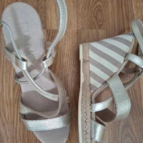 Tyylikkäät kiilakorkosandaalit kauniissa kullan värissä. Sopivat juhlaan, kesämenoihin tai arkeen tuomaan näyttävyyttä asuun.