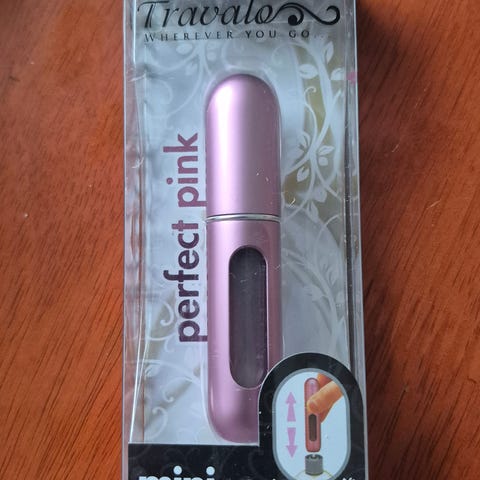Mustakoteloitu täytettävä matkakokoinen hajuvesipullo. Pieni ja kompakti koko, sopii esimerkiksi käsilaukkuun tai taskuun. Pullossa on irrotettava suutin, jonka kautta se voidaan täyttää suosikkituoksulla isommasta hajuvesipullosta. Soveltuu hajuveden tai kevyen suihkutettavan nesteen säilyttämiseen ja kuljettamiseen matkalla tai arjessa.