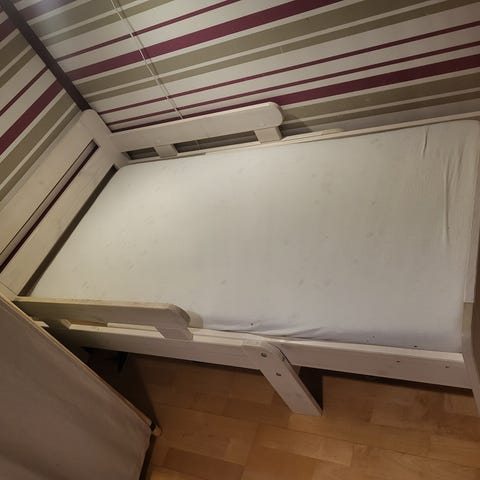 Ei paljon käyttöjälkiä, mutta säileet yläosa teippattu. Ei vaikutta uneen, sänky käytettäväksi jatkettuna tai ei.