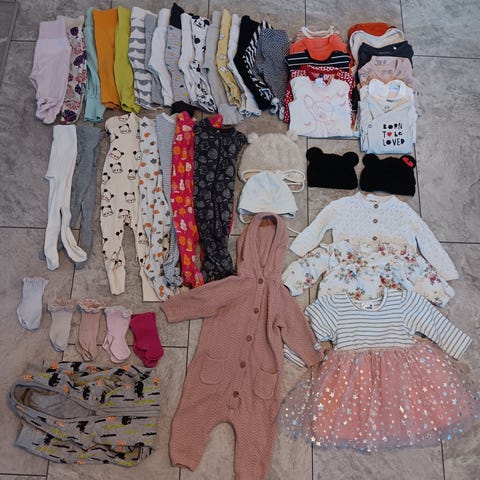 Iso vaatepaketti tytöille, koko 62/68. Kirjava kokonaisuus, johon kuuluu useita eri vaatekappaleita, kuten bodyja, housuja, sukkiksia ja mekkoja, yöpukuja, kevääseen haalari, pipoja, tumput. Vaatteissa on erilaisia kuoseja ja värejä.