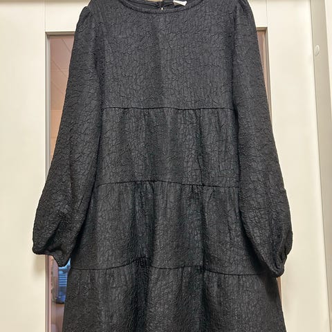 Hieno musta juhlamekko isolla rusetilla. Pussimainen kaunis helma. Koko 140 cm.
