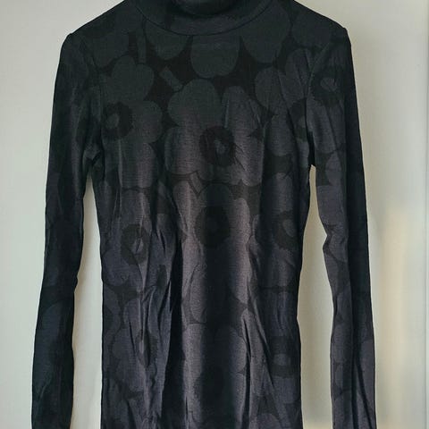 "Pitkähihainen, vartalonmyötäinen malli, jossa poolokaulus. Kuosina klassinen Unikko-kuvio tummissa, kirjavissa sävyissä. Materiaalina merinovilla. Sopii käytettäväksi sellaisenaan tai kerrospukeutumisessa arki- ja toimistokäyttöön. Ohuessa poolopaidassa on raakareunat hihansuissa sekä helmassa."