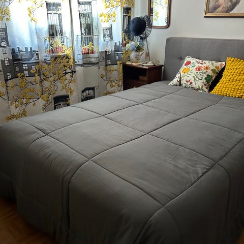 Hyväkuntoinen päiväpeite. Koko 220x240. Toinen puoli sileää kangasta ja toinen puoli samettimaista. Voi käyttää molemmin puolin.