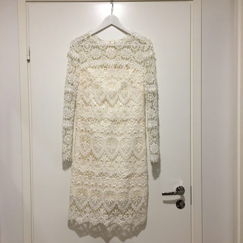 Pitkä valkoinen pitsimekko naisille, koko XS. Mekossa on kapea, vartaloa myötäilevä malli ja olkaimet. Päällikangas on läpikuultavaa pitsiä kukkakuvioilla ja alla on yksivärinen alusmekko. Sopii esimerkiksi juhla- tai iltamekoksi.