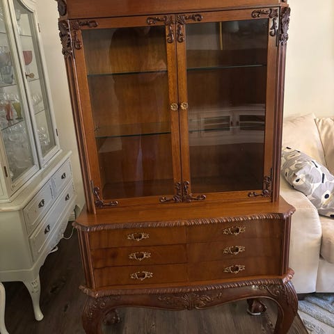 Vitriinikaappi lasihyllyillä ja laatikolla ruskea puu