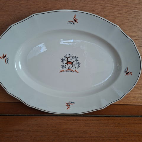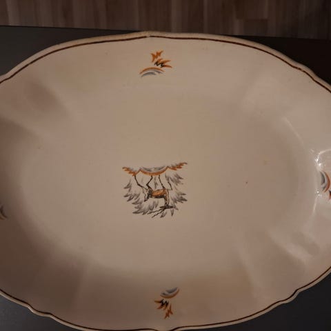 Pituus 38,5cm ja leveys keskellä 27cm. Ei paloja poissa, ei halkeamia eikä krakelontia. Valoa vasten peilatessa muutamia jälkiä välineistä. Joitain valmistuksen aikaisia pisteitä tai massa möykkyjä. Piippuleima 1932-49. Upea iso vati! Ei Toridiiliä. Nouto tai Matkahuollon lähetys.