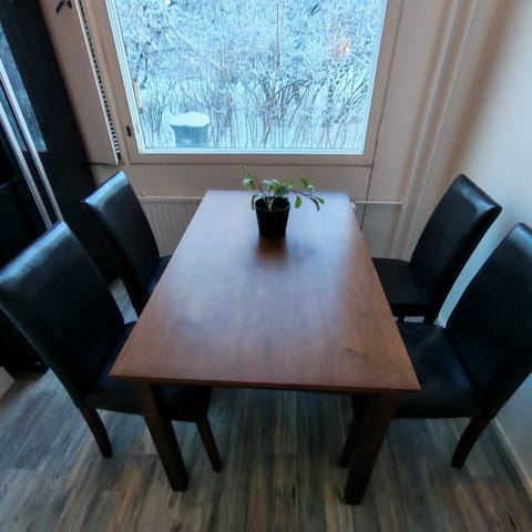 Tukevarakenteinen ruokapöytä ja tuolit. Pöydän kannessa ja tuoleissa kulumaa, mutta ovat hyvässä kunnossa. Lisätietoja/kuvia saa kysyttäessä. Sijaitsee hervannassa. Vain nouto. Eläintalous.