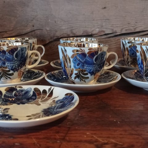 Astiasto on ehjä ja hyvässä kunnossa. Jossain kohdissa pienesti kultaus kulunut, mutta erittäin vähäisesti. Astiasto on kaunis ja siisti. Punaiset leimat pohjassa.