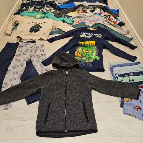 Hyväkuntoinen poikien vaatepaketti koko 110-116, kirjava. Paketissa useita erilaisia vaatteita arkeen ja ulkoiluun, muun muassa toppatakki, haalarihousut, uusi collegepuku, kerrasto joka kerran käytetty, Vans pipo, hyvät kumpparit 29 ja kuravaatteet, uudet farkut, naamiaisasu Sonic, Dinopyyhe, valkoiset tennarit 30, Reiman villahousut 116, uudenveroiset. Molo merinovilla myssy jossa fleese vuori. Vaatteet on mitoitettu noin 110-116 cm pitkälle lapselle. Paketti hyvä, uudehkoja. Hetken käytetty yhdellä.