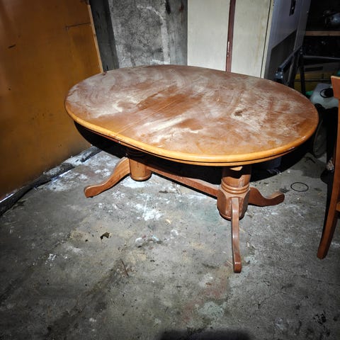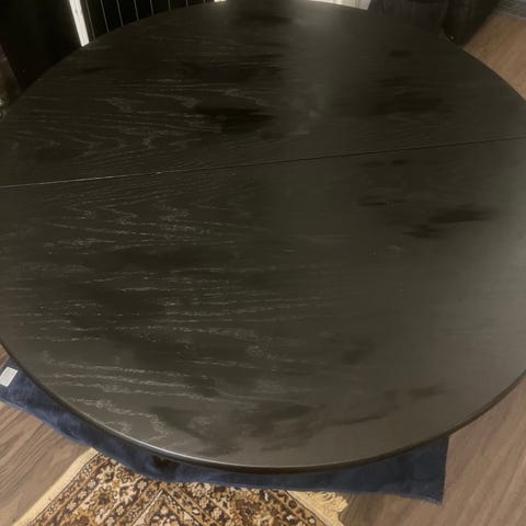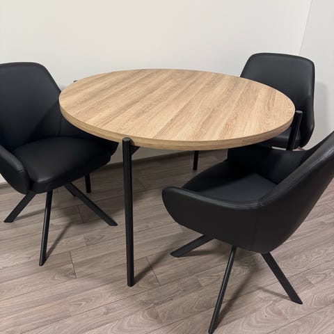 Muuton vuoksi myyntiin pyöreä valkoinen ruokapöytä ja kuvassa olevat neljä tuolia. Pöydän korkeus 74cm ja halkaisija 100cm.