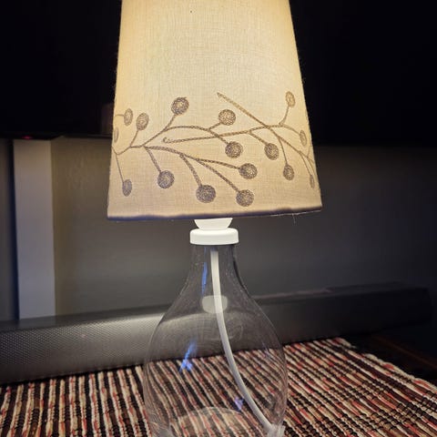 Myydään punainen pöytävalaisin pitkällä sähköjohdolla.