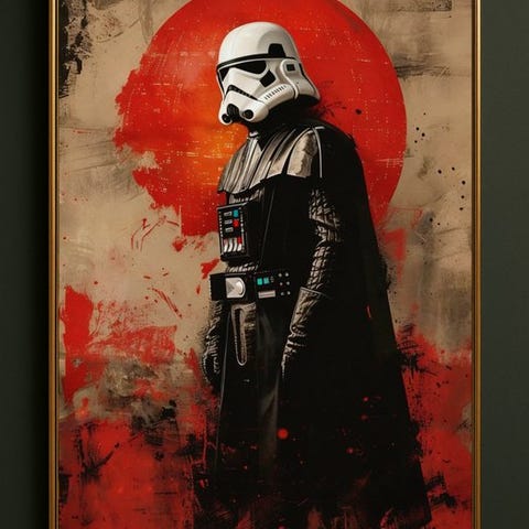 Soggetto ja teemaDarth Vader kuvataan kävelemässä yksinään punainen lasermiekka sykätenä, ympärillään savun ja valon pilvi, joka hajoittaa hahmon ja taustan rajat. Ikonin, uhkaavan ja hallitun hahmon kontrasti harmaantuvan ja lähes mystisen tunnelman kanssa muuttaa tunnetun antagonistisen hahmon enemmän sisäänpäin kääntyväksi kuin hyökkääväksi läsnäoloksi.Teos uudelleenlukee Vaderin myytin ei vain vallan ja pimeyden symbolina, vaan myös sisäisen konfliktin embleemina, joka on jännityksessä tuhon ja lunastuksen välillä maisemassa, joka vaikuttaa olevan sodan ja muistin kuluttama.Se on visuaalinen manifesti niille, jotka tunnistavat itsensä persoonallisuutensa monimutkaisimmista ja ambivalenttisimmista puolista, löytämällä kauneutta myös varjoista ja siirtymävaiheista. Hahmo, joka etenee savussa, muuttuu hiljaisen vastarinnan metaforaksi: jatketaan silti eteenpäin, vaikka ympärillä olisi kaaosta ja tuhkaa.Tekniikka ja luominenTeos on toteutettu sekatekniikalla ja vesiväreillä paperille, käyttämällä maalaustapaa, joka yhdistää figuurin ja abstraktion: hahmo on määritelty ja luettavissa, kun taas tausta on elävä massa pigmenttejä, valumia ja kerroksia. Epäsäännölliset siveltimenvedot ja väriläikät luovat lähes savimaisen tekstuurin, joka seuraa viitan liikettä ja korostaa kohtauksen häivyttävää vaikutelmaa.Väripaletti vaihtuu tummiin sävyihin, poltettuihin ja sinertäviin, lämpimien punaisen ja oranssin salamoiden kanssa, jotka muistuttavat tulta, pimeän puolen energiaa ja laser-iskun valoa. Kokonaisuus muistuttaa elokuvan still-kuvaa, joka on muutettu maalaukselliseksi kuvaksi, jossa realistinen yksityiskohta antaa tilaa tunteille ja tunnelmalle.Inspiraatio ja uteliaisuusStar Warsin kuvasto uudelleenmääritellään taiteellisella tavalla, muuttaen elokuvakulttuurin pop-ikonin 'maallisen pyhimyksen' kaltaiseksi subjektiksi, lähes pyhitettynä figuuria ympäröivän säteen vuoksi.– Kovaksi mustaksi panssariksi ja taustan sulavuudeksi kontrasti viittaa kontrollin ja kaaoksen väliseen konfliktiin, järjestyksen ja tunnekuohun välillä.Teos puhuttelee sekä saga-faneja että nykytaiteen harrastajia: se on kuva, joka yhdistää elokuvallisen estetiikan ja maalaustaiteellisen herkkyyden, täydellinen niille, jotka etsivät vahvaa teosta, joka kertoo tarinan myös saga-viittauksen ulkopuolella.StatoUusi, ei kehystetty.ToimitusVahvistetussa suojaputkessa tapahtuva lähetys, joka on suunniteltu suojaamaan paperia ja maalipintaa kansainvälisen kuljetuksen aikana.Hienostunut ja pohdiskeleva teos, joka on ihanteellinen niille, jotka rakastavat klassisen Japanin viehätystä ja laadukasta digitaalista taidetta.Sylar-t on italialainen digitaalinen taiteilija, syntynyt vuonna 1995, aktiivinen yli 15 vuotta visuaalisen taiteen maailmassa.tutkimukseni syntyy kohtaamisesta analogisten työkalujen, digitaalisen ohjelmiston ja tekoälyjen välillä, yhdessä.Jatkuu jännite ihmisen kontrollin ja algoritmisesti aiheutuvan kaaoksen välillä.Vuosien kokeilujen jälkeen Photoshopissa, Procreatessa ja animaatiossa hän on ottanut myös tekoälyn käyttöönsä.generatiivinen työkalu luovuudelle, ilman että koskaan luovutaan vahvasta, ironisesta ja omaleimaisesta näkemyksestä.Usein terävä. Hänen tyylinsä sekoittaa digitaalista pop-taidetta, konseptuaalisia elementtejä ja kulttuuriviittauksia.Contemporanea teoksissa, jotka rikkovat sääntöjä mutta säilyttävät vahvan esteettisen johdonmukaisuuden.Sylar-t:n digitaaliprintit, jotka on tehty rajoitetussa erässä, on suunniteltu niille, jotka etsivät teosta.vaikuttava, visua