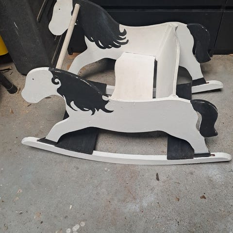 Pientä korjausta vaativa keinuhevonen. Selkänojassa lohkeama, katso kuvat. Nouto Kastusta.