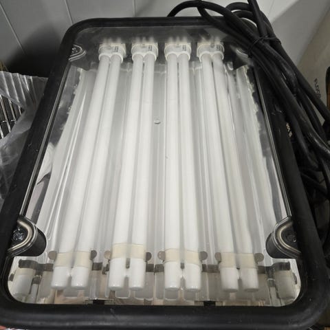 Teollinen työmaavalaisin, jossa useita rinnakkaisia valoputkia läpinäkyvän suojakannen alla. Valaisimessa on useita sinisiä pistorasioita rungon sivussa, mikä mahdollistaa sähkölaitteiden liittämisen samaan yksikköön. Runko on mustaa materiaalia ja suunniteltu lattia- tai maatasoon sijoitettavaksi. Soveltuu esimerkiksi työmaille, varastoihin tai muihin tiloihin, joissa tarvitaan laajaa ja tasaista valaistusta sekä lisäpistorasioita sähkötyökaluille tai muille laitteille.