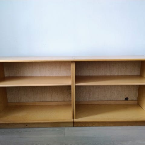 Laitteille kolme tasoa, joista yli ulos vedettävä. Kaappi vinyylilevyille ja laatikot cd/kasetti.