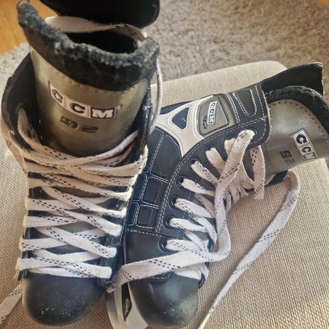 CCM D1 jääkiekkoluistimet lapsille. Koko 33. Väriltään mustat harmailla ja valkoisilla yksityiskohdilla. Terät kiinnittyvät valkoiseen teräkoteloon. Soveltuvat jääkiekkoon ja yleiseen luisteluun lapsille, joilla kengännumero on noin 33.