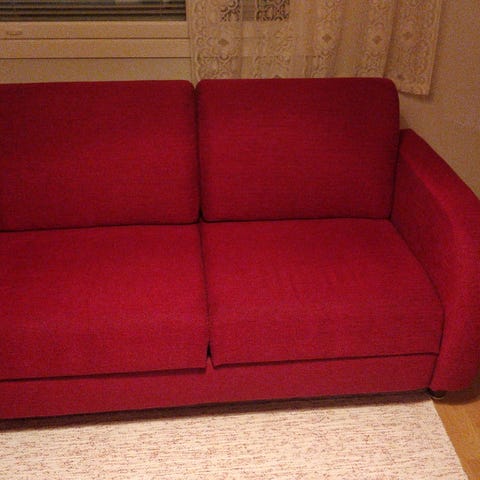 Vuodesohva, jossa vihreä kangasverhoilu ja säilytystila istuinosan alla. Sohva soveltuu istumiseen ja nukkumiseen, ja sen sisään mahtuu esimerkiksi vuodevaatteita.