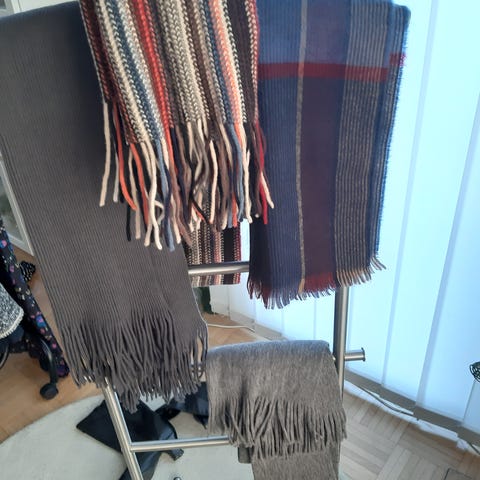 Punainen neule, harmaa fliisi.
