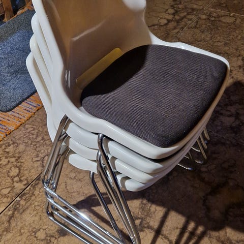 Valkoiset vintage Overman-muovituolit 3 kappaletta. Design Svante Schöblom, made in sweden. Pieniä naarmuja/kolhuja sivuissa, mutta yleisilmeeltään oikein siistit ja mukavat istua.