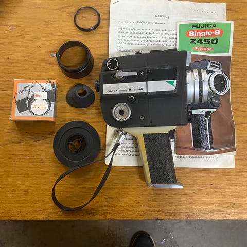 Kameraan tulee virta ja nauha pyörii, mutta kuvassa pystyraita. Vaatii joko korjauksen tai sitten varaosiksi. Ostettu uutena ja seissyt laatikossa useita vuosia käyttämättömänä (aikanaan toiminut normaalisti). Maksanut joskus yli 8000 markkaa.