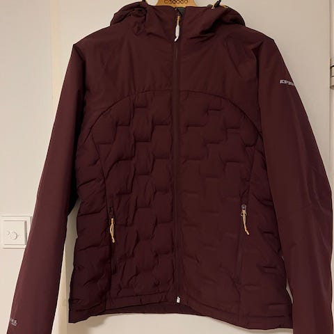 Icepeak naisten ulkotakki, koko 40. Väri oranssi. Materiaalina puuvilla. K-k 48 cm, pituus 70-75 cm. Takissa on edessä vetoketjukiinnitys ja läpälliset etutaskut vetoketjulla, hihatasku ja sisäsivutasku. Hupussa on turkisreunus ja molemmat ovat irrotettavissa. Vyötärökiristysnauha. Malli on hieman pidempi ja selästä kevyesti muotoiltu. Sopii arjen ulkoiluun ja kaupunkikäyttöön.