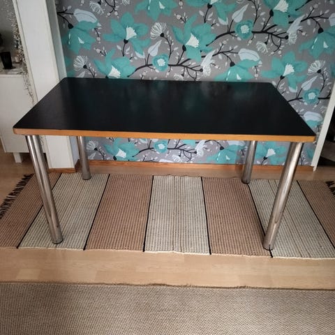 Ruokapöytä, yksi kulma saanut osumaa, muuten siistikuntoinen.