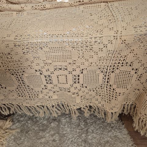 Ihana ihana virkattu parivuoteen pitsipeitto uutta kotia vailla. Kermanvaalea. Kukkamainen kuvio.