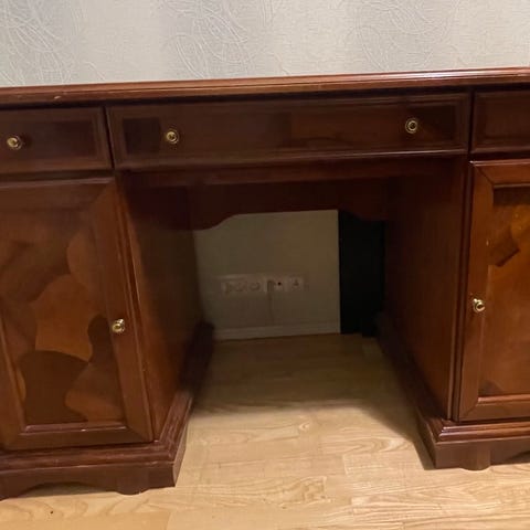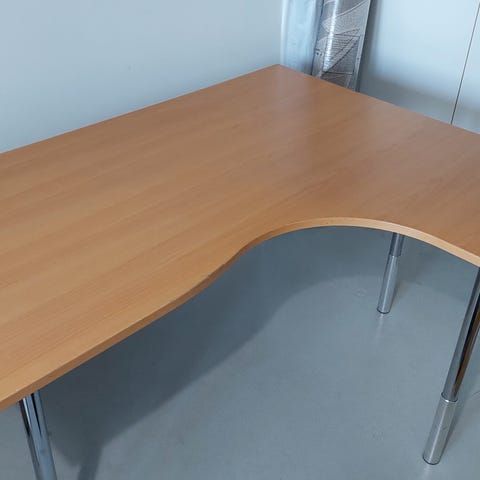 L-muotoinen työpöytä. Vanha toimistopöytä, joka alunperin Iskusta. Pöydän kunto hyvä ja ainoat jäljet ovat pöydän alla jalkojen ja johtokourun kiinnistysreistä (kouru ei kuulu kauppaan). Jalkojen pituudet ovat 71cm. Vain nouto. Pöytä on kuvien mukaan purettuna odottamassa hakua.