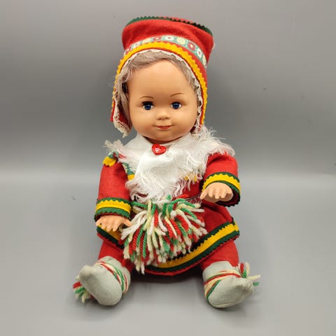 Vanha saamelaistyylinen nukke huopavaatteissa siistissä kunnossa. Jalat, kädet ja pää liikkuu. Pituus 35 cm.