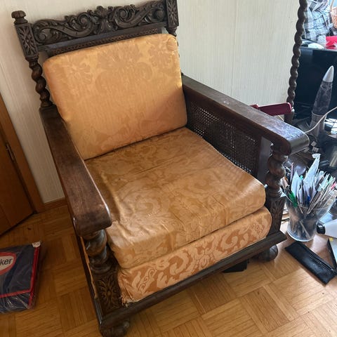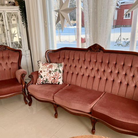 barokki / klassisen tyylinen sohva ja nojatuoli, joissa on ruskea / beige samettinen kangasverhoilu ja tummaksi käsitelty puurunko. Valmistaja ei tiedossa. Sohvassa on kaareva selkänoja ja muotoillut käsinojat, samantyyliset yksityiskohdat toistuvat nojatuolissa. Molemmissa istuimissa on pehmustettu istuin- ja selkäosa.