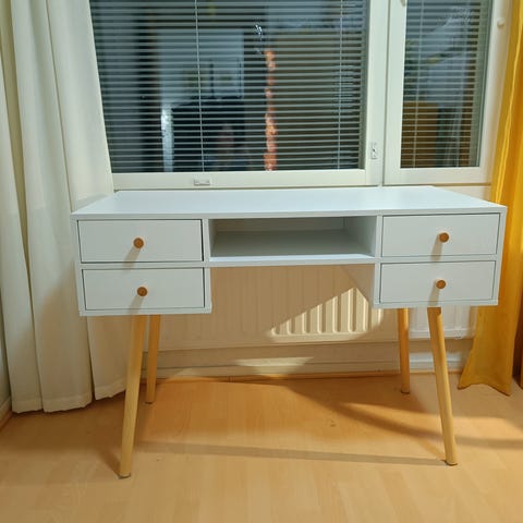 Zara Home kirjoituspöytä ja tuoli valkoinen puu. Pöydässä on suorakulmainen taso, neljä suoraa jalkaa ja yläosa, jossa on kaksi pientä laatikkoa sekä avohyllyjä. Pöydän alaosassa on kaksi leveämpää laatikkoa metallivetimillä. Tuolissa on suorakulmainen istuin, suorat jalat ja selkänojassa pystypinnat. Materiaalina on maalattu puu, väri valkoinen. Sopii esimerkiksi työpisteeksi, läksypöydäksi tai pieneen kotitoimistoon.