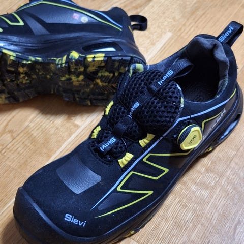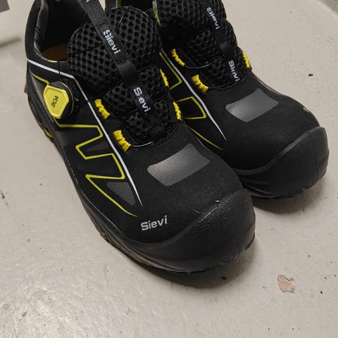 Sievi Lazer Roller+ S3 tennarit, koko 40. Mustat turva-/työkengät, joissa on nauhaton BOA-tyyppinen kiristysmekanismi. Kengissä on S3-turvaluokitus, joka sisältää muun muassa varvassuojan, naulaanastumissuojan ja suljetun kantapään. Soveltuvat työ- ja suojajalkineiksi ympäristöihin, joissa vaaditaan turvakengät.