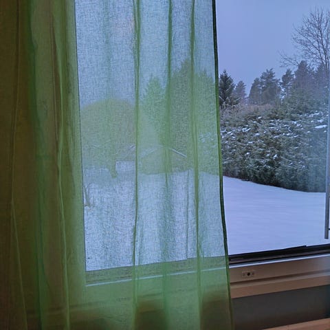 Myydään sievä Annon valko-harmaa kuviollinen verho. Käytetty, ehjä ja siisti.