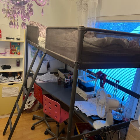 Masku Parvisänky, valkoinen. Purettuna. Yksi pultti katkaistu, muuten osat paketissa. Mukana työtaso sekä hyllykkö. Kokoomisohje saatavilla netistä.