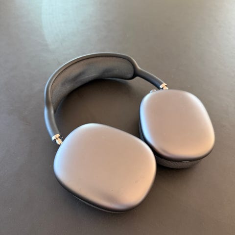 Apple AirPods Max -langattomat kuulokkeet, sininen sanka ja kotelo sekä hopeanväriset kupit. Over-ear-mallinen kuulokemalli, pehmustetut korvatyynyt ja metallinen runko. Sopivat yleiseen musiikin kuunteluun, videoiden katseluun ja puheluihin yhteensopivien laitteiden kanssa Bluetooth-yhteydellä. Kulumaa ja kolhuja on, mutta toimivat kaikin puolin. Lightning versio
