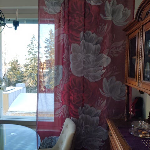 Tästä seuraavalle jääkiekkosankarille sisustusta huoneeseen. Ompelijalla teetetyt Vallilan ysiviis verhot ja 2 kpl tyynyn päällisiä 60x60 ja 40x40. Verhot täysin moitteettomat ja uuden veroisessa kunnossa. Tyynyn päälliset hiukan haalistuneet mutta oikein hyvä kuntoiset.