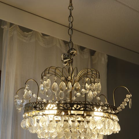 Hakusanat; Kristallilamppu, kristalli, messinki, brass lamp, chandelier, Made in Finland, Retro, Vintage, kattolamppu, valaisin, kristallikruunu, Finnish design