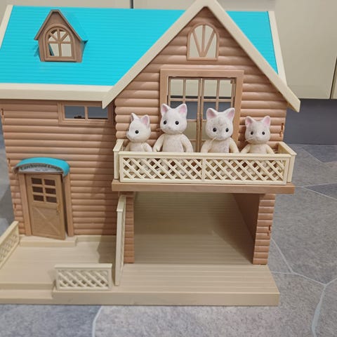 Sylvanian Families koti ja viisihenkinen kissaperhe. Kaksikerroksinen talo, jossa parveke, portaat ja useita huoneita. Mukana paljon kalusteita ja pientarvikkeita, kuten sänky, leluja, pöytiä, tuoleja, keittiökaapisto, jääkaappi, keittiövälineitä ja ruokaa. Kunto kuin uusi. Vain nouto Oulun Koskelasta.