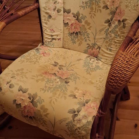 Muuttomyynti. Korituoli keinumekanismilla. Mekanismi ehjä ja rasvattu. Pehmuste alkuperäinen.