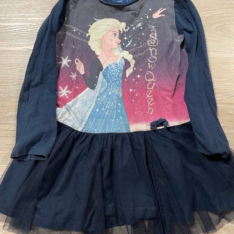 Disney Frozen -mekko 110-116-koossa (5-6 vuotta, mutta meillä oli käytössä 4-vuotiaalla).