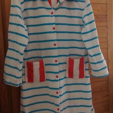 House lasten kylpytakki tytöille, koko 160. Väri valkoinen. Materiaali polyesteriä. Kylpytakissa on vyö ja huppu. Sopii käytettäväksi esimerkiksi kylvyn tai suihkun jälkeen tai kotona oleskeluun. Hihassa kulumaa näkyy kuvassa kaksi.