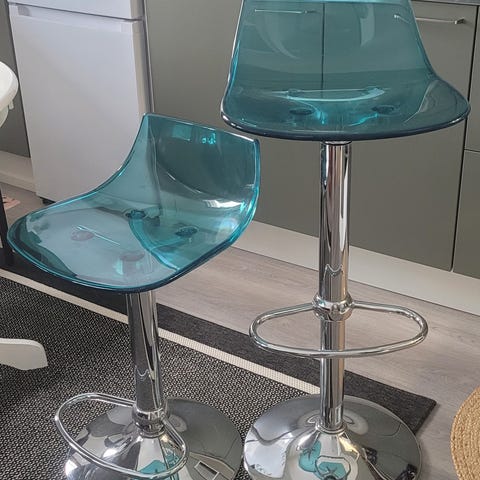 Kaksi alkuperäisesti Elloksen baarituolia. Mustat metallirungot ja samettiset istuimet. Mukavat istua ja tukevat. Kuvassa näyttää ehkä pieneltä, mutta ovat oikeasti korkeat ja isot. Istuinkorkeus 75cm.