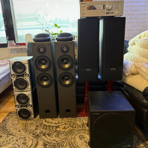 Kaiutinpaketti, johon kuuluu useita puuviilupintaisia hyllykaiuttimia ja kaksi isompaa kaiutinta. Etulevyissä on erilliset basso- ja diskanttielementit, ja yhdessä kaiuttimessa on irrotettava etusuoja. Mukana on myös useampi musta hifi-laite, joita voidaan käyttää esimerkiksi vahvistimina tai soittimina osana äänentoistojärjestelmää. Sopii esimerkiksi kotiteatteri- tai stereokäyttöön. Tarkemmat tekniset tiedot, tehot ja liitännät kannattaa varmistaa paikan päällä, koska mallimerkinnät eivät näy selkeästi kuvissa.