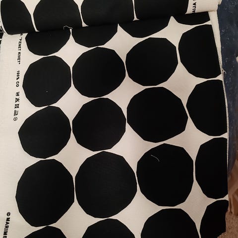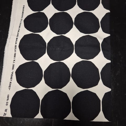 Tarpeettomana myyntiin, Marimekon Kivet kuosia kevyt markiisikangaspala pituus 62cm ja leveys 156cm, kts. kuvaa kuvio ei ole ihan reunaan asti. Kankaassa taitoksia pitkästä säilytyksestä, mutta muuten siisti, ei haalistumia! Värit - pohja farkunsininen, kuvio musta.