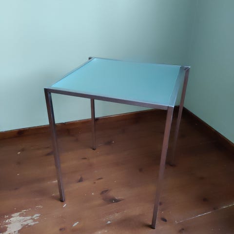 Ehjä ja ihan siisti pöytä jossa lasilevy. Pöydän koko 65x68cm, lasilevy siis 65x65cm. Korkeus 48cm.