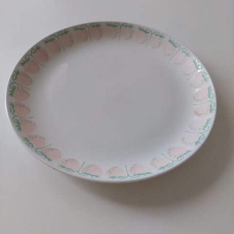 Arabian Pomona-sarjan mansikkalautanen, jossa yksi pieni halkeama. Valmistettu 1967 toukokuussa. Mansikoissa jossain haalistumaa. Hyvässä kunnossa 60vuotta vanhaksi.