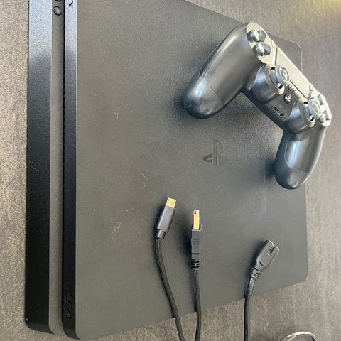 PS 4 slim, 1TB konsoli, 2 DualShock 4 ohjainta, HDMI ja virtajohto, mikrofoni, ohjeet ja laatikko.